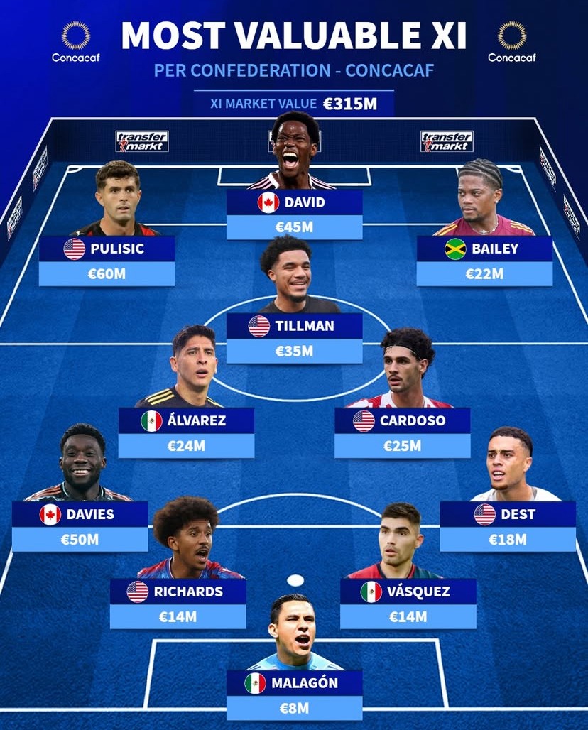 北京时间10月16日,转会市场网站公布了当前中北美洲及加勒比地区球员中身价排名前11的阵容,其中身价达到6000万欧元的普利希奇位列榜首,身价5000万欧元的阿方索-戴维斯以及身价4500万欧元的乔纳森-戴维均位列其中。转会市场网站公布中北美洲及加勒比地区球员身价最高的11人阵容:守门员马拉贡(来自墨西哥/美洲队)身价800万欧元后防线德斯特(美国籍/效力于埃因霍温)身价1800万欧元、巴斯克斯(